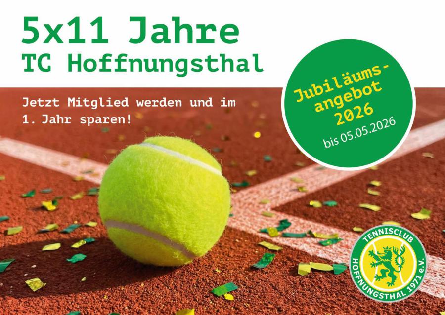 Mitten im Grünen trainieren, Wettkämpfe gewinnen und danach in der Sonne entspannen. Seit 1971 bietet der Tennisclub (TC) Hoffnungsthal seinen Mitgliedern ideale Bedingungen für Spiel, Sport und Vergnügen. Auf unserer Clubanlage in der Region Rösrath sind sowohl Anfänger als auch erfahrene Tennisspieler jeden Alters willkommen. Wir laden dich herzlich ein, gemeinsam mit uns, Freunden und Familie, die Freude am Tennis zu erleben.